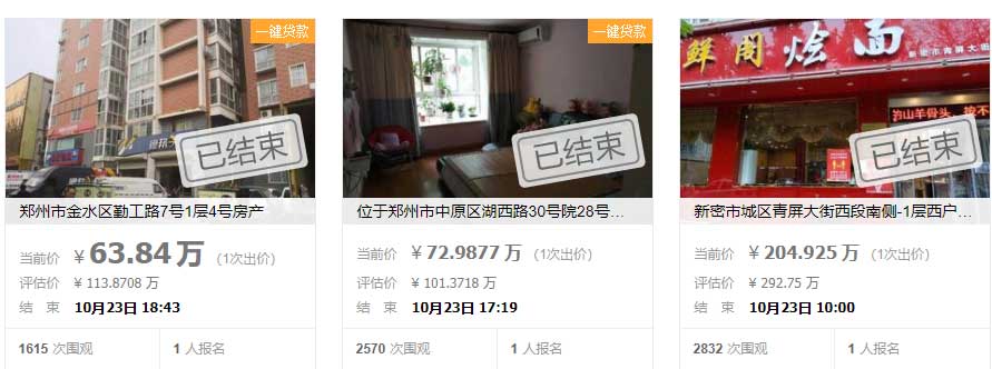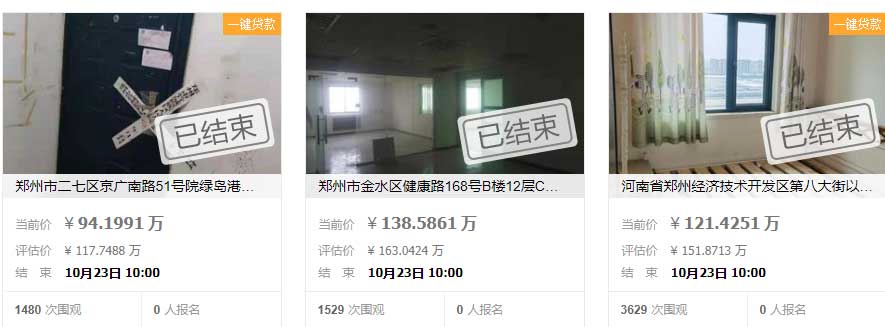 上述个案只是一个缩影。记者在阿里拍卖上发现,郑州的法拍房交易近期频现折价,仅10月23日就有多笔交易的成交价低于评估价几十万元。