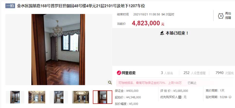 10月21日,郑州一套法拍房在经过54次出价后,最终以482.3万出手,低于市场价80万元。