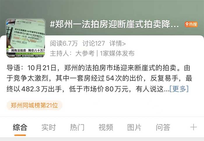 近日,”郑州一法拍房迎断崖式拍卖降80万”的消息登上热搜。从法拍信息看,该房源成交价为482.3万元,大幅低于评估价的568.5万元。