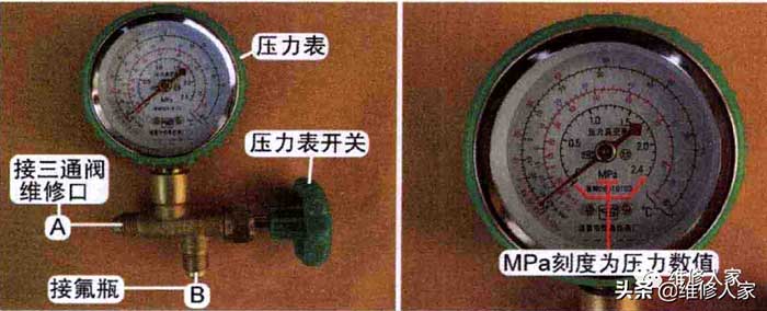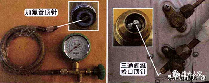 ①首先关闭压力表幵关,将带顶针的加氟管一端连接三通阀维修口,此时压力表显示系统压力:空调器未幵机时为静态压力,幵机后为系统运行压力。