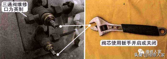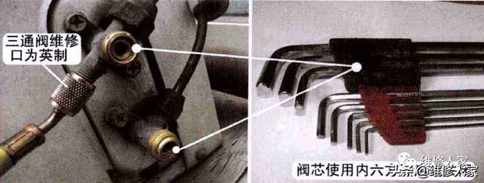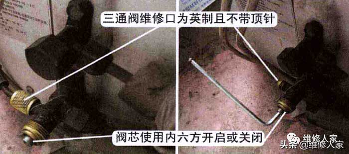 见下图。三通阀维修口为英制,并且带顶针,阀芯使用内六方幵启或关闭,根据空调器品牌或型号不同,使用内六方型号也不一样,比如海信空调器通常使用4mm,美的空调器通常使用5mm。