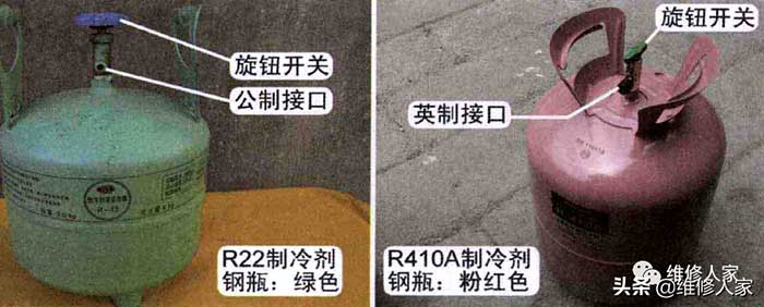 制冷剂钢瓶实物外形见下图,俗称氟瓶,用来存放制冷剂。因目前空调器使用的制冷剂有多种,早期和目前通常为R22,而目前新出厂的变频空调器通常使用R410A或R32。为了便于区分,两种钢瓶的外观颜色设计也不相同,R22钢瓶为绿色,R410A(R32)为粉红色。