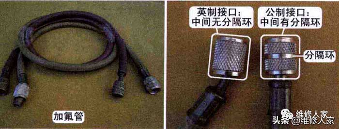 见图(b)和(c),例如加氟管一端为英制接口,而氟瓶为公制接头,彼此不能直 接连接。使用公制转换接头可解决这一问题,转换接头一端连接加氟管的英制接口,一端连接氟瓶的公制接头,使英制接口的加氟管通过转换接头连接到公制接头的氟瓶。