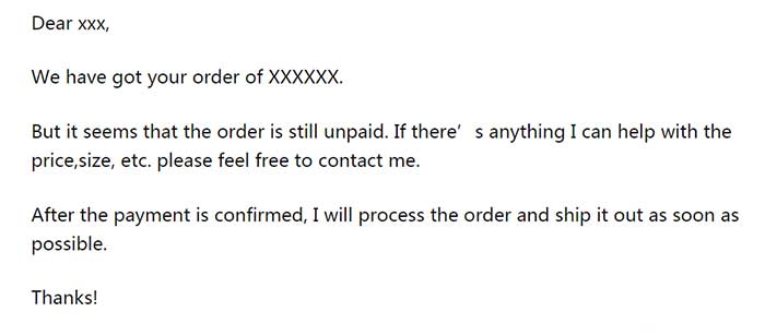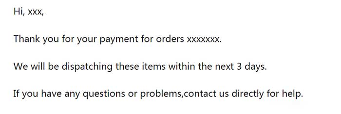 客户支付过订单后,为了显示公司流程规范和实力,建议给客户去一封邮件告知。邮件顺带告知客户这批货的预计发货时间,表示自己会一直跟进并保持沟通即可。