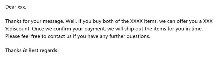 淡季时,我们往往需要进行促销,因此群发促销邮件变得非常重要了。促销邮件同样需要简短、清晰,因为国外客户不会花很多时间去阅读你的邮件,你只需要把自己的促销亮点(产品特点,价格)告知清楚即可。
