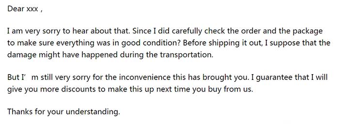 处理投诉需要有耐心并且不卑不亢。因此在邮件回复时,建议先表达自己的歉意,并表示一定会跟进问题、解决问题。如果公司有相对应的政策,可以提及政策,例如优惠政策折扣政策等等。客户一般会提及自己的损失,但也十分担心我们不配合而造成更严重的后果,所以尽力保留着老客户,避免流失客户资源。