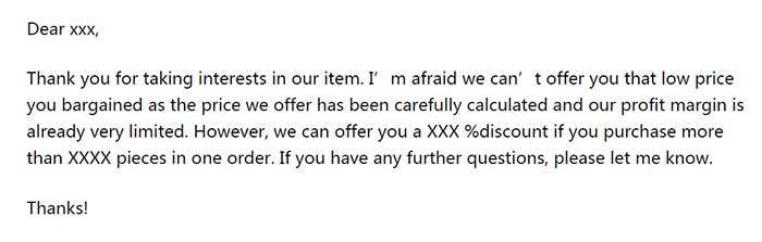 其实在议价过程中,需要注意的是,要表达清楚自己希望买家采购多少数量才能提供什么样的折扣。而且,比价议价也不是一味需要让价,“一分钱一分货”的质量问题需要告知清楚买家。