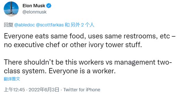 马斯克接着该网友的话说,每个人都吃同样的食物,使用同样的洗手间等等 —— 没有行政总厨或其他象牙塔的东西。不应该有这种工人与管理层的两级制度。每个人都是工人。