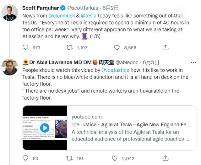 软件开发和协作工具 Atlassian 的 CEO Scott Farquhar 在推特上反驳了马斯克的观点,并列举了居家办公的一系列优点。接着有人表示,在特斯拉工作没有蓝 / 白之分,每个人都在工厂车间,没有办公桌,工厂车间也没有远程工作人员。