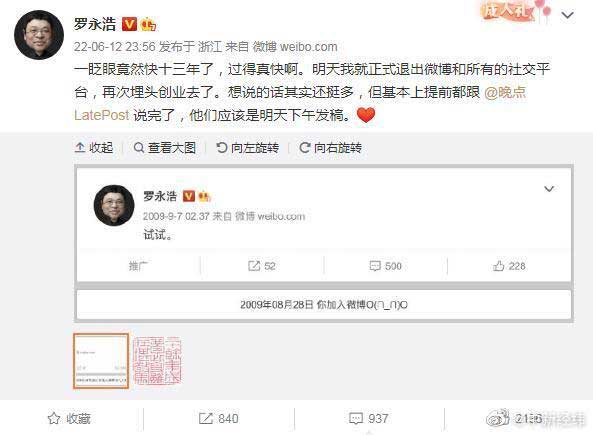 6月12日晚间,@罗永浩 发布微博称,将再次埋头创业,并退出所有社交平台。