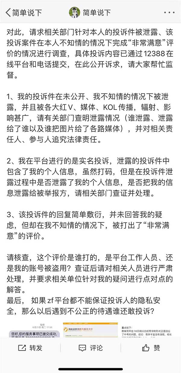 “简单说下”认为,根据湖南省教育厅文件规定,相关投诉的处理进度、反馈结果,只有投诉者本人可以凭借投诉认可短信中的“查询码”查询,且结果只有投诉者本人才能看到,“本人没有授权相关部门进行公开,且网站上根本无法公开查询,那么流传到网络上的截图从何而来?”