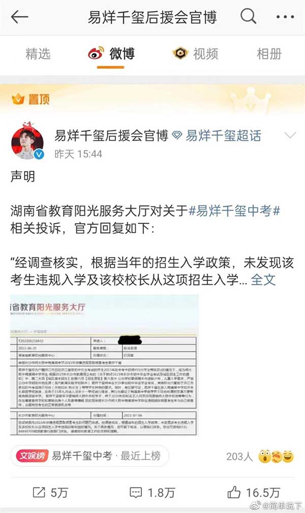 7月8日,网友“简单说下”在微博提到,自己于6月21日在湖南省教育阳光服务大厅填写的“有关易烊千玺中考违规入学”投诉举报件,其回复内容在尚未公开且她并不知情的情况下,于7月7日被易烊千玺后援会和一些娱乐大V公开并传播。
