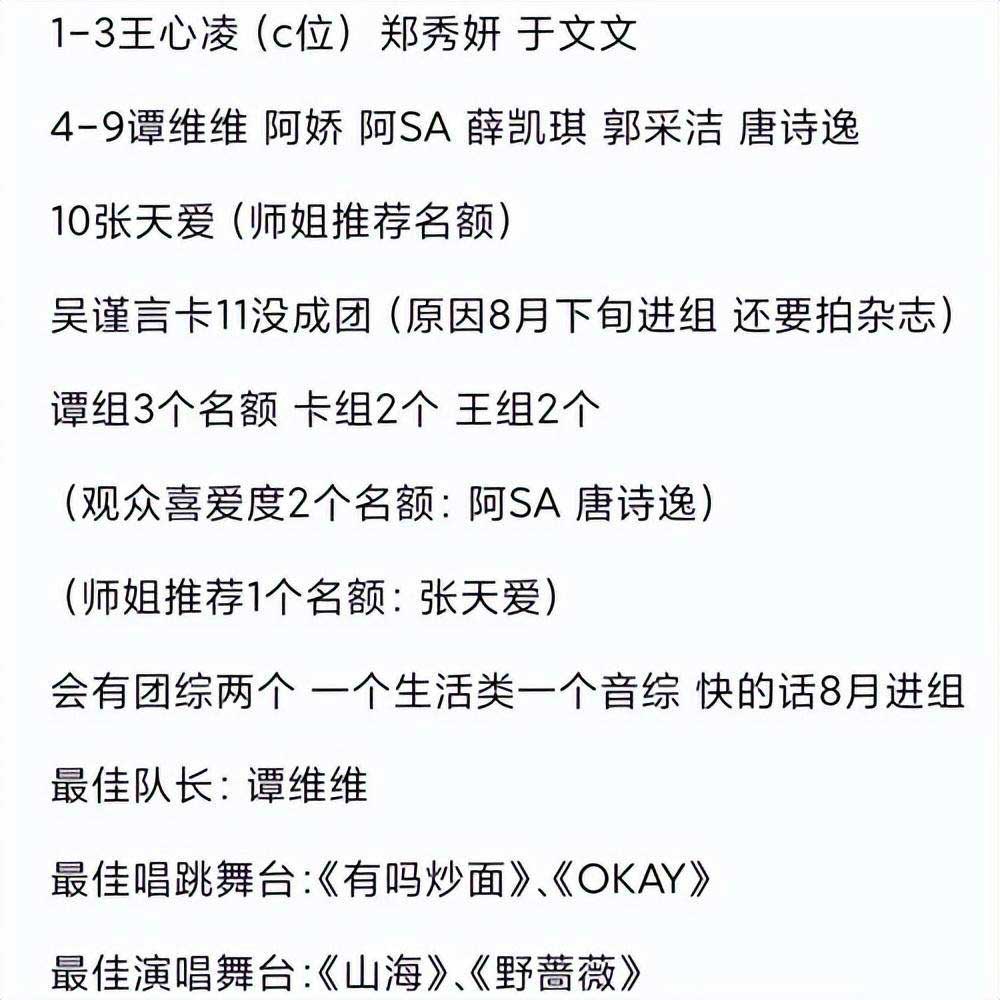 最终团队名额为9+1,多出来的一个名额为“师姐推荐名额”,由张天爱获得。前九名依次为王心凌、郑秀妍、于文文、谭维维、钟欣潼、蔡卓妍、薛凯琪、郭采洁和唐诗逸,加上张天爱,共计10人成团。