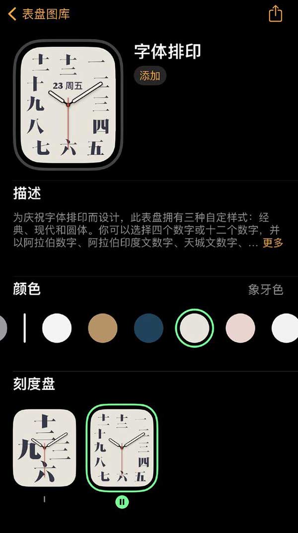 苹果官方介绍,该表盘是为庆祝字体排印而设计,此表盘拥有三种自定样式:经典、现代和圆体。你可以选择四个数字或十二个数字,并以阿拉伯数字、阿拉伯印度文数字、天城文数字等显示。据悉,目前只有升级到 iOS 16、WatchOS 9 Beta 测试版才可获取该表盘。