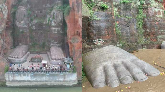 8月20日,四川省乐山市境内大渡河、青衣江和岷江水流量明显减少,位于三江交汇处的乐山大佛“真身”也全部露出。目前,乐山大佛与往年8月同期正常水位相比低了近2米。