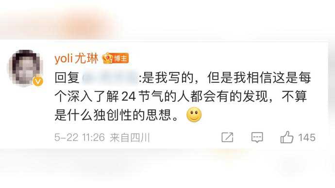 #博主回应北大满哥被指抄袭其观点#5月22日,奥迪陷入抄袭风波。有网友质疑原创者“北大满哥”疑似抄袭“yoli尤琳”的观点,对此“yoli尤琳”回应,每个深入了解24节气的人都会有此发现。