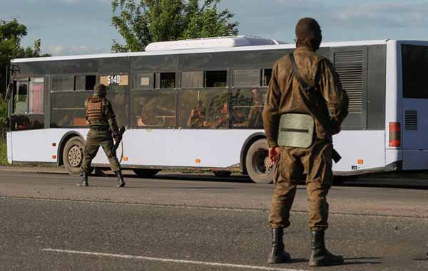 ↑过去几天里,载有乌方投降人员的巴士在俄罗斯军队的陪同下离开亚速钢铁厂